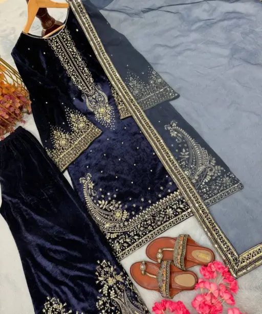 Navy Blue Embroidery Pakistani Velvet Suit