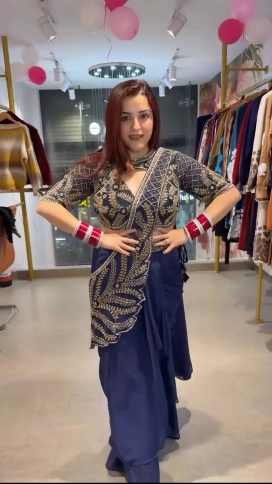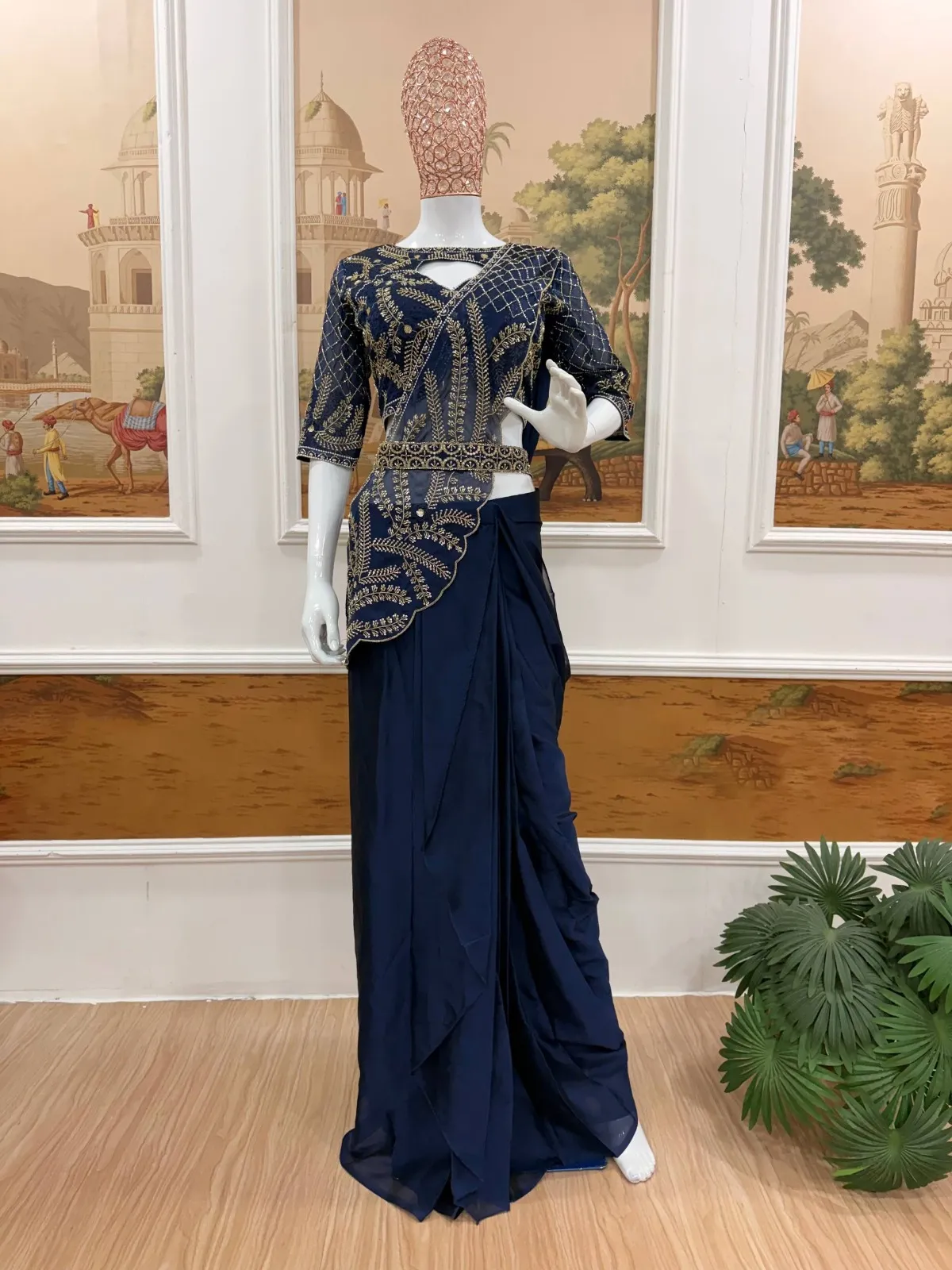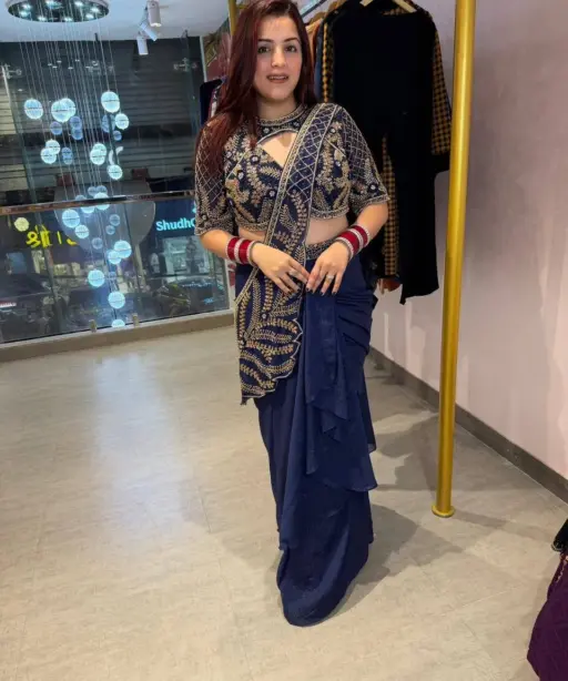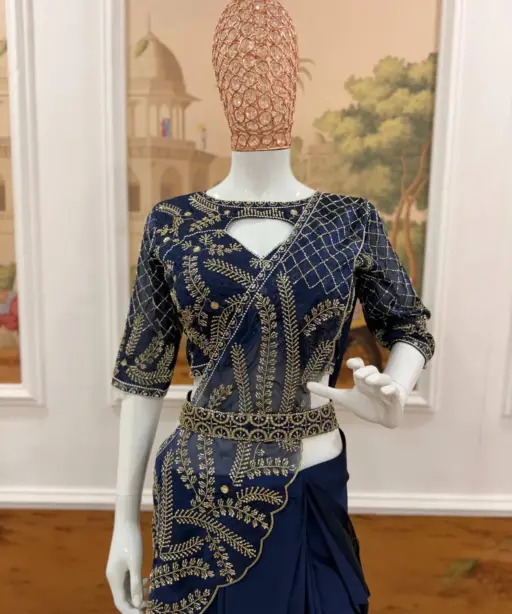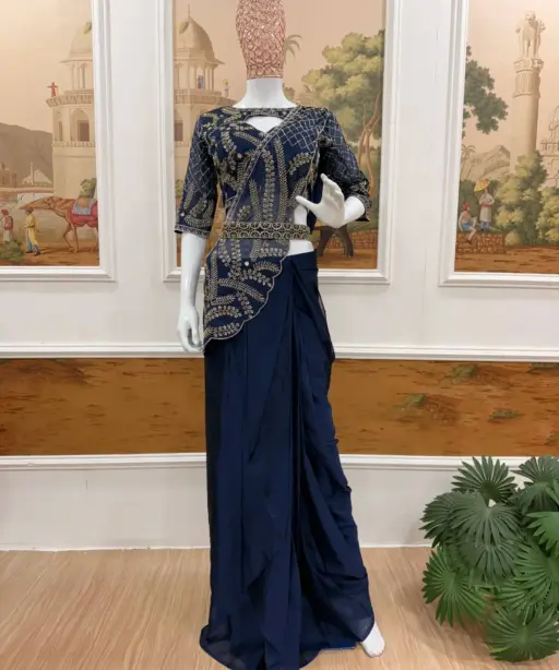 Navy Blue Readymade Saree with Embroidery Pallu