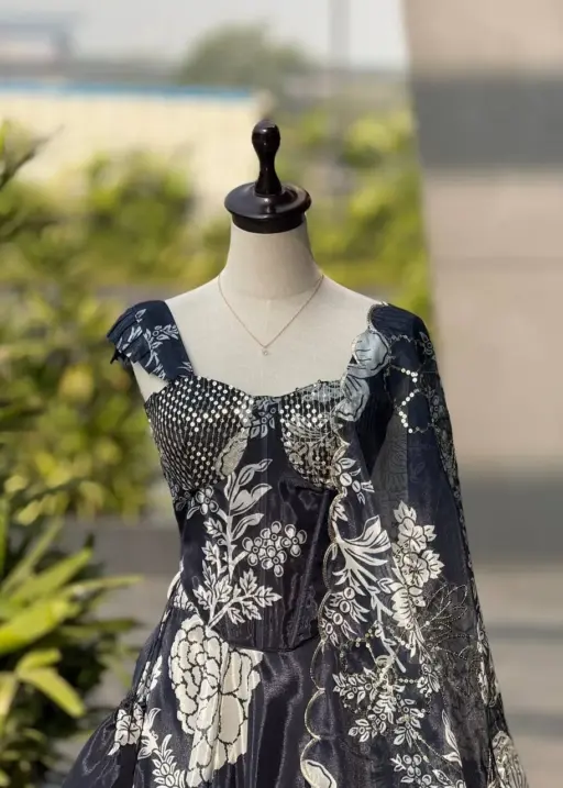 | Lehenga | Pure jimmy Organza digital printed lehnga .8mtr flair lehnga with canvas patta, can can and with adjustable waist dori |