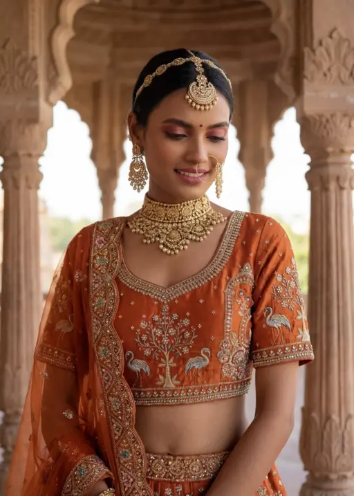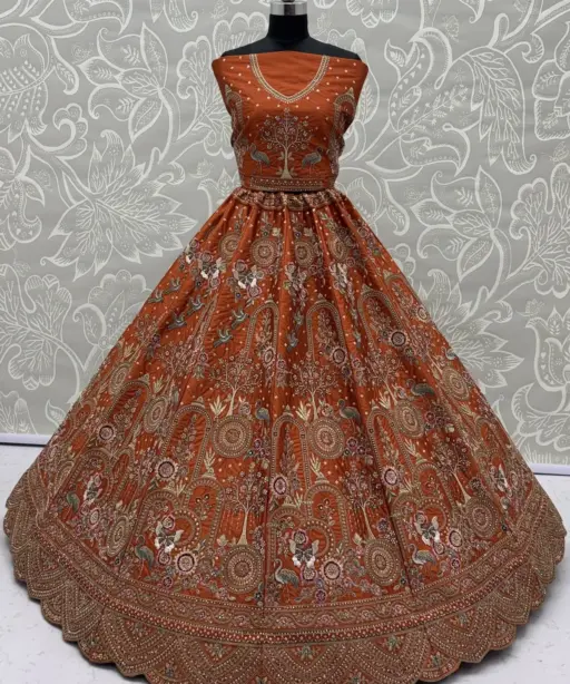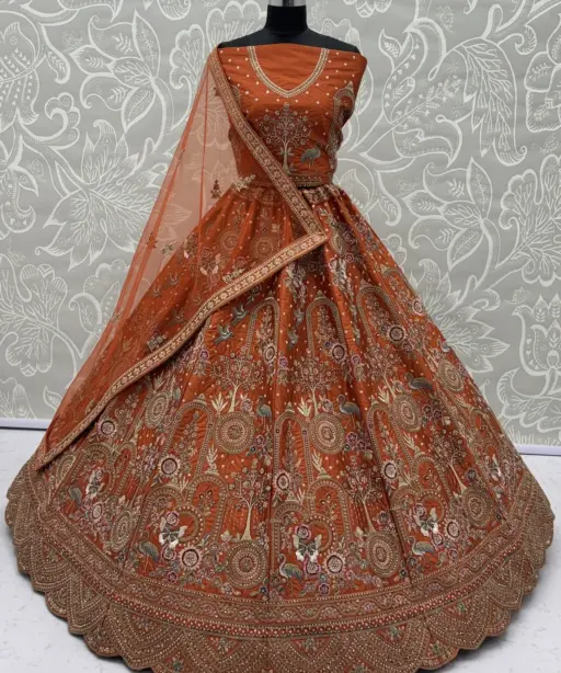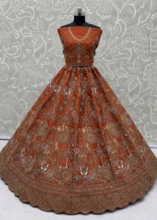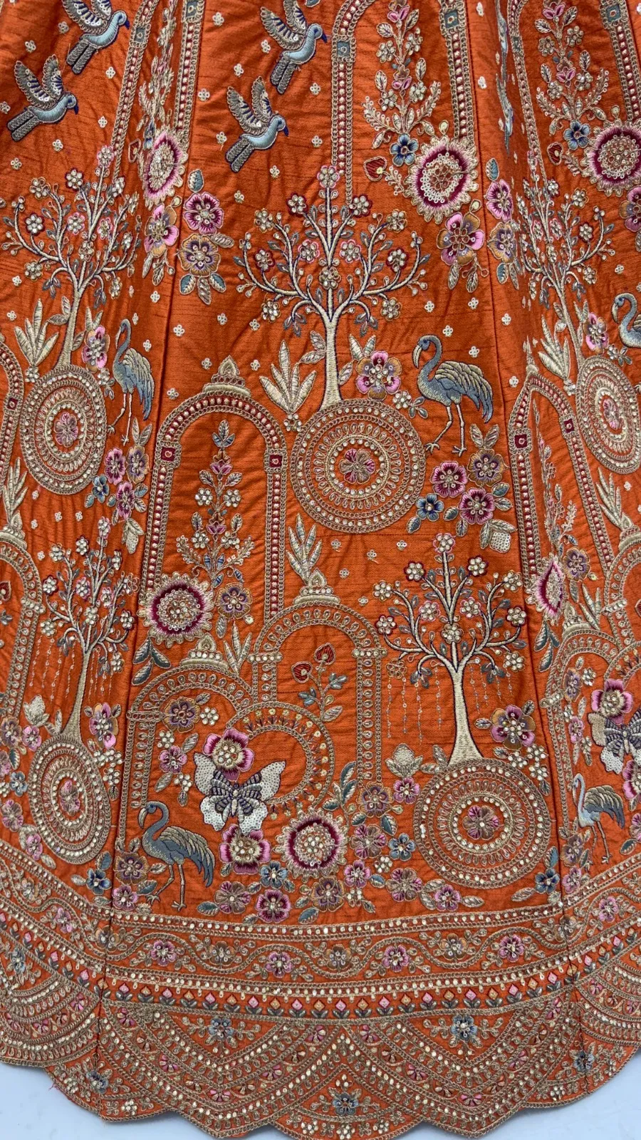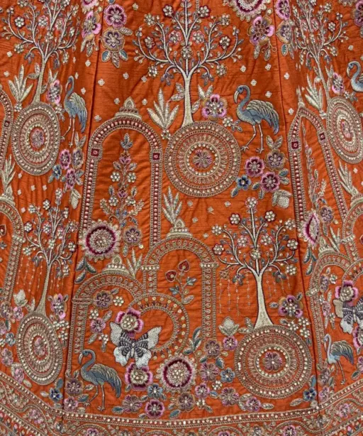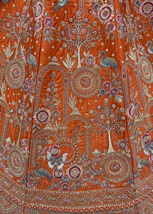 | Lehenga | Gadhwal Silk Golden Dori work, Elephant and Figure work Chappat Zari and Thread work Sequins as well Diamond work 4 meter Plus Flair |