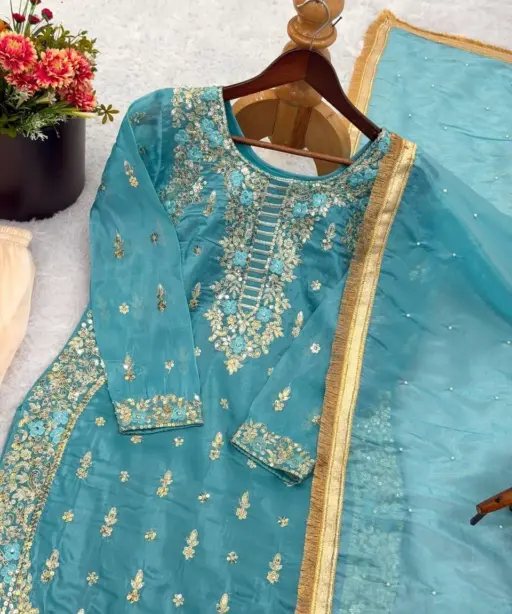 | Top | Pure GMY SILK With Heavy Embroidery Sequence Work With Full Sleeve Top Length 41-42 Inches |