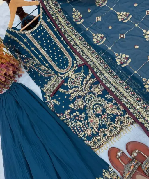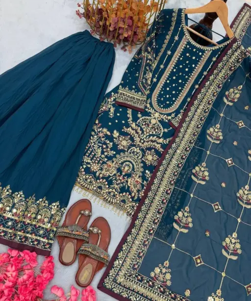 | Top | Heavy Faux Georgette with Heavy Embroidery 5 mm Sequence Work with Rivet Moti Work with Sleeves with Fancy Latkan Border 37-38 Inch Length |