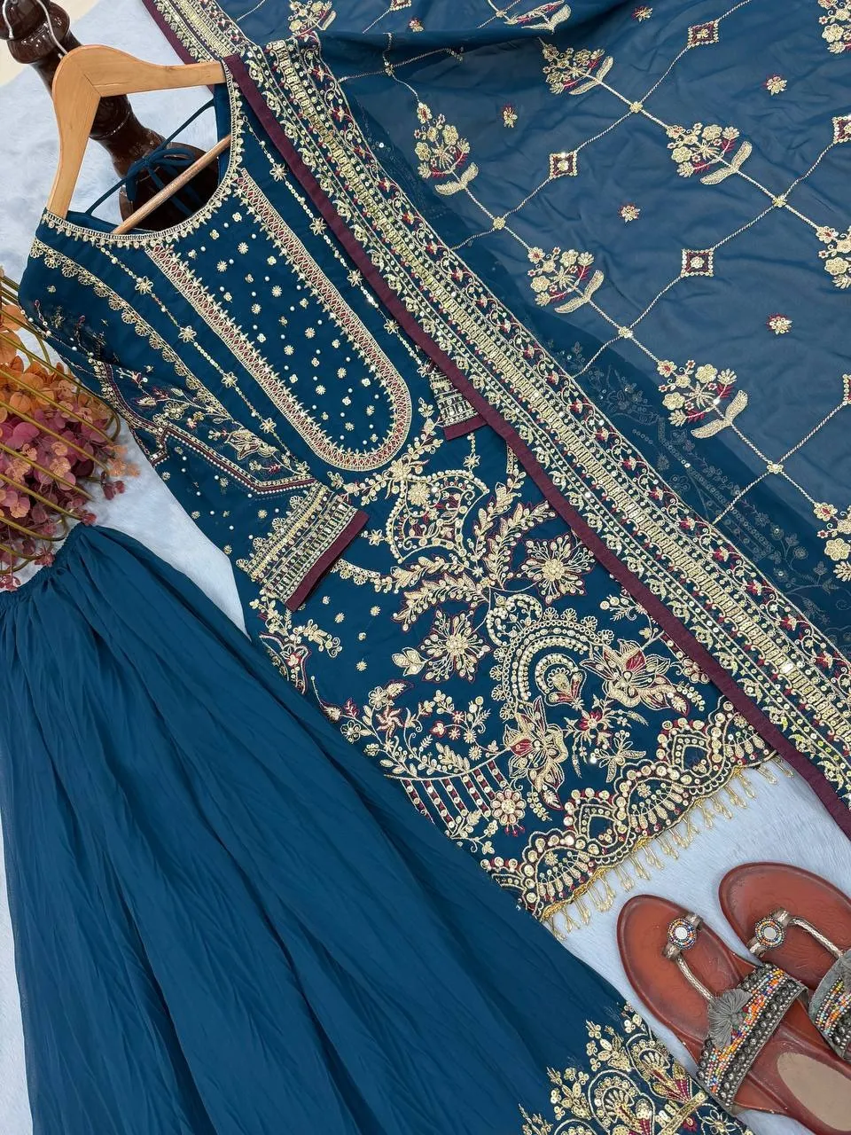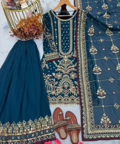 | Bottom | Heavy Khajuri Crush Faux Georgette with Heavy Embroidery 5 mm Sequence Work with Elastic 40-41 Inc Length |