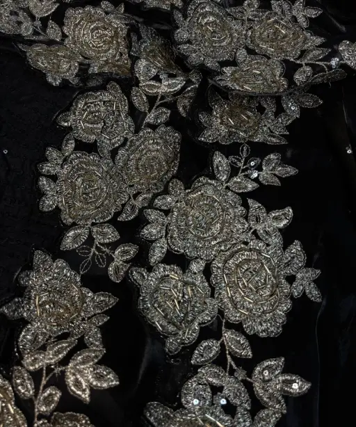 Black never goes out of style—and this saree proves exactly why. The deep black base enhances the beauty of the delicate floral embroidery, making each motif pop with charm and detail. Whether you’re attending a night event or a modern-day function, this saree offers a sleek, elegant look with just the right amount of drama.
