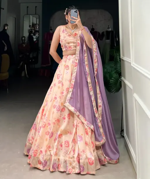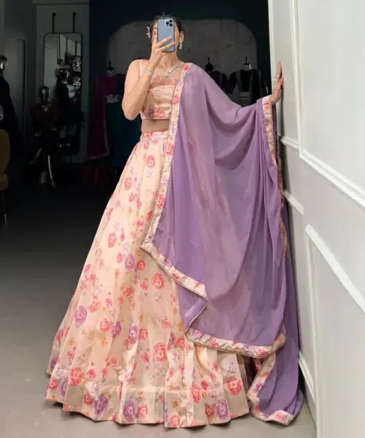| Lehenga | Tussar Silk with Floral Print, Stitched with Canvas and Can Can, Drawstring with Zip |