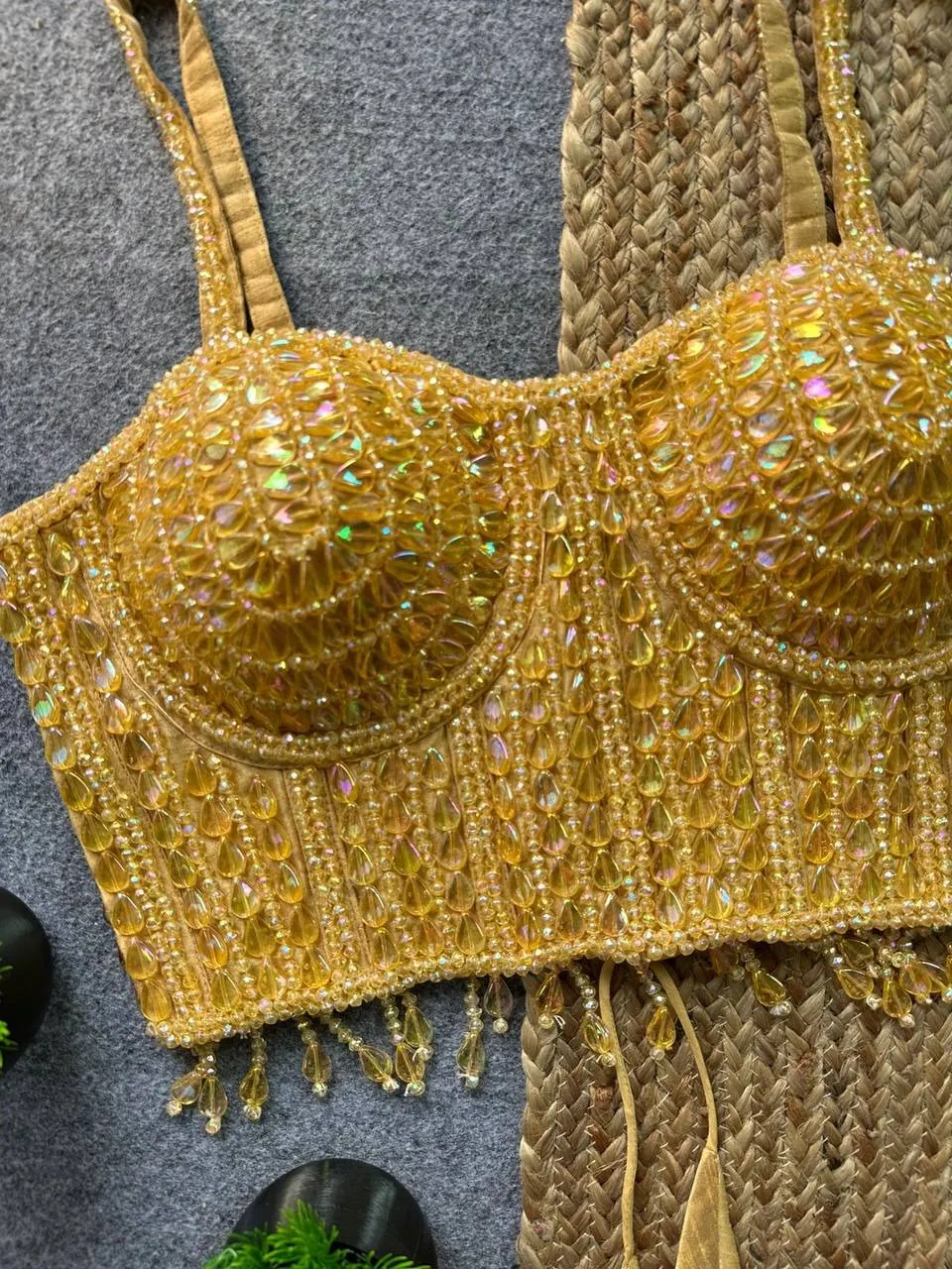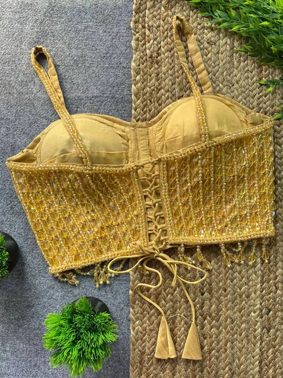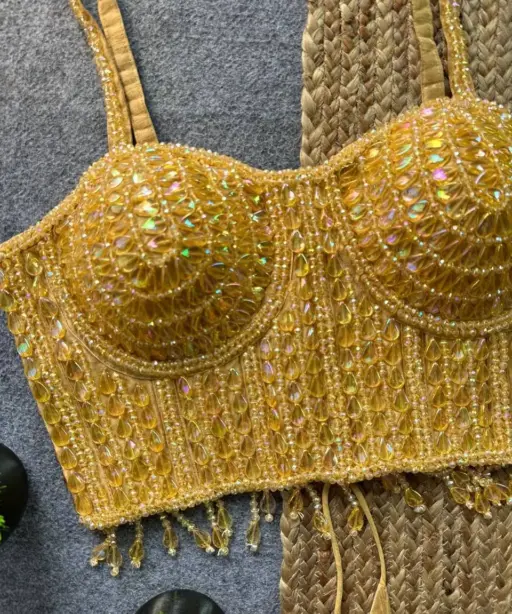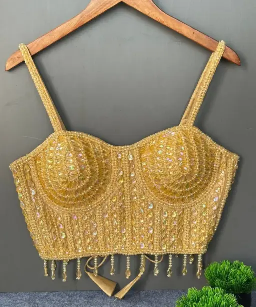 Party Wear Pearl Moti Spaghetti Blouse Golden