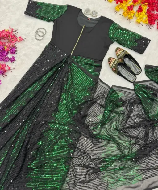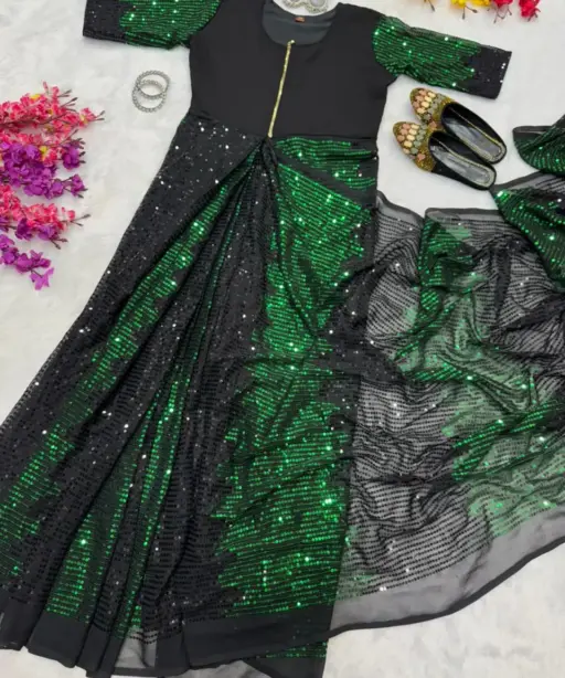 Party Zip and Go Saree with Green Sequence work