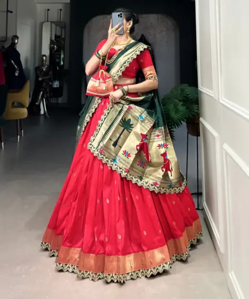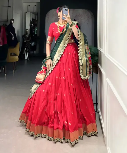 | Lehenga | Jacquard Silk (Paithani) Lehenga Work Zari Weaving Work With Sequins and Thread Embroidery Scallop Lace Border Length: 41 Inch, Flair: 3.80 Meter |