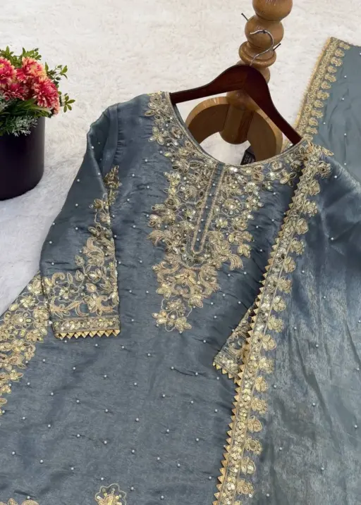 | Top | Pure GMY SILK With Heavy Embroidery Coding Sequence Work With Moti Work and Full Sleeve 41-42 Inch Length |