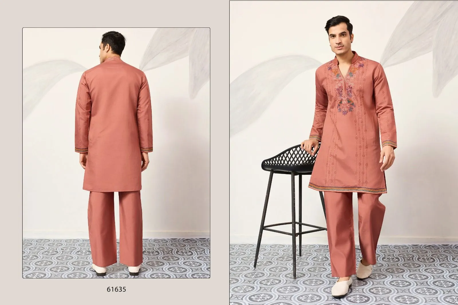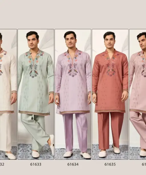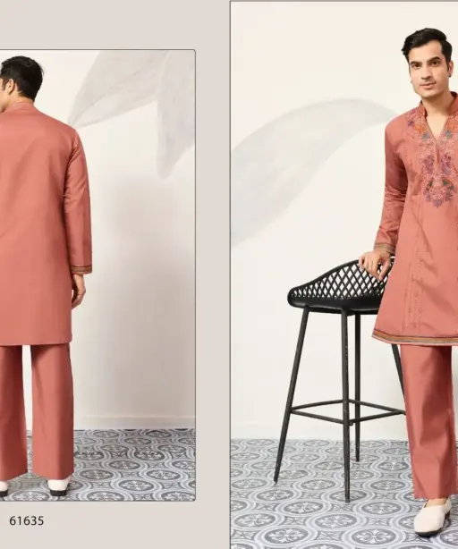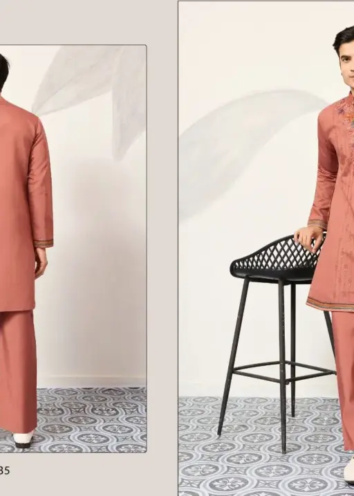 Pastel Orange Mens Embroidery Kurta Set