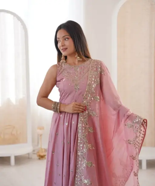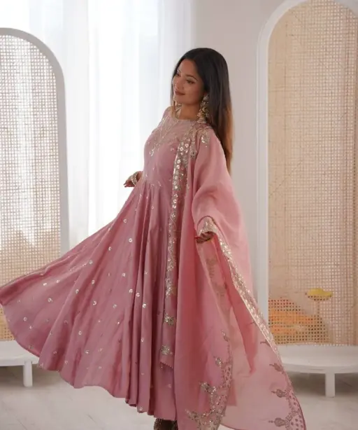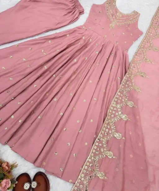 | Top | Roman silk Embroidery Sequence work Heavy Micro Cotton Inner 48-49 Inches, Length 3.75 meter Flair |