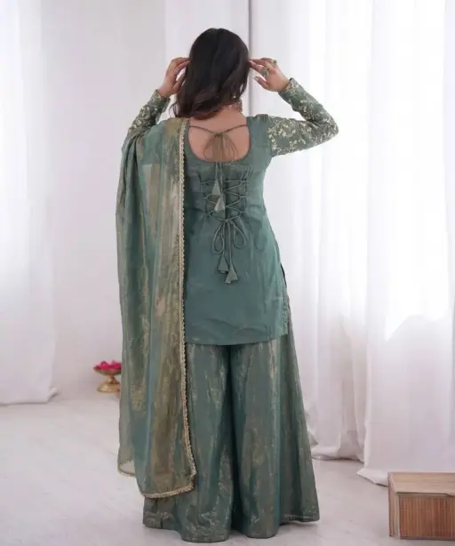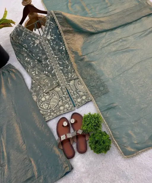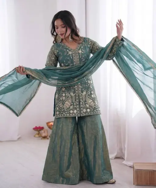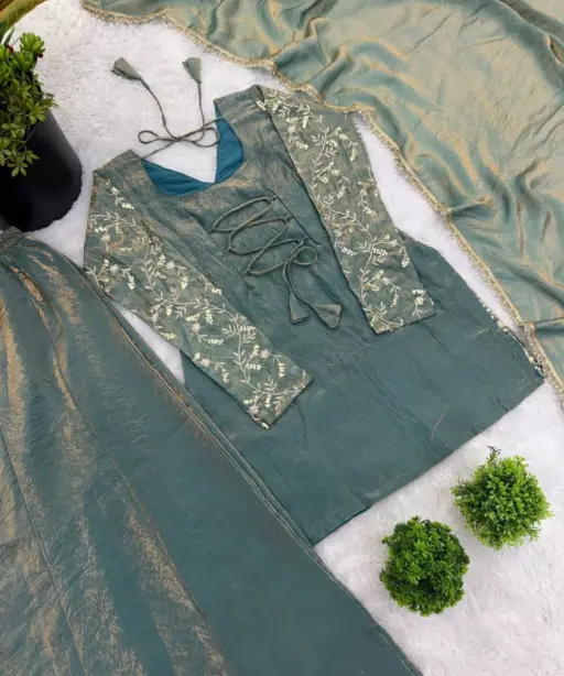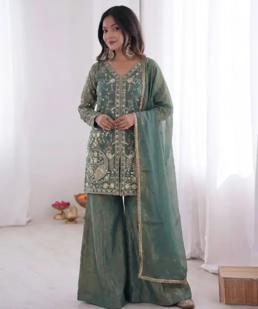 | Top | Pure Fendy silk With Heavy Embroidery Sequence Work With Sleeves 30-31 Inch Length |