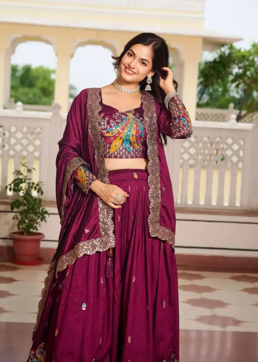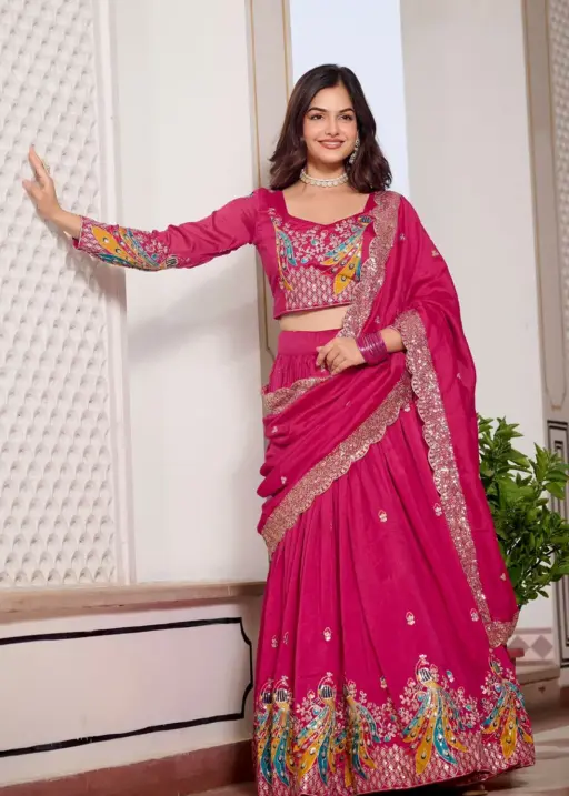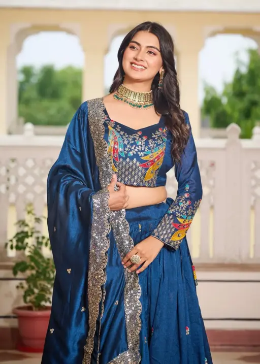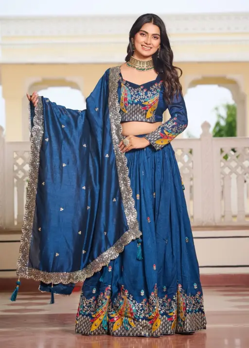 LehengaPure Vichitra with Heavy Embroidery Sequence & Thread Work, Attached Canvas and Cancan, Flair 3.5 Mtr, Inner Micro Cotton, Size 44, Full Stitched with Dori