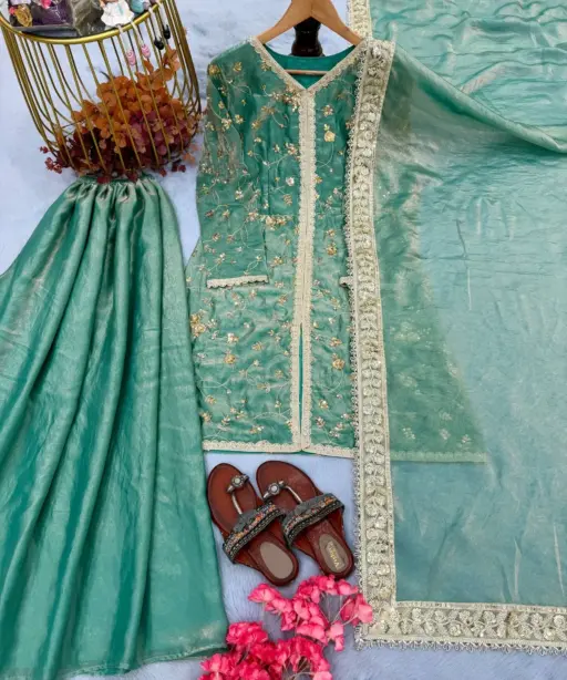 TopPur Fendi Silk With Heavy Embroidery 3&5 mm Sequence & Coding Dori Work With Rivet Moti Work With Sleeves 38-39 Inch Length