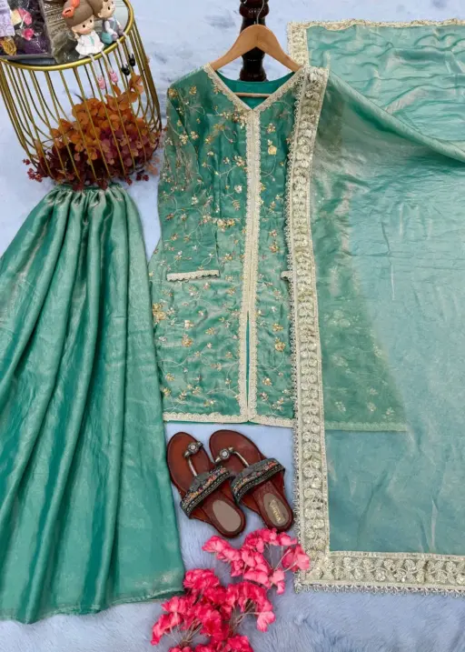 | Top | Pur Fendi Silk With Heavy Embroidery 3&5 mm Sequence & Coding Dori Work With Rivet Moti Work With Sleeves 38-39 Inch Length |