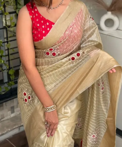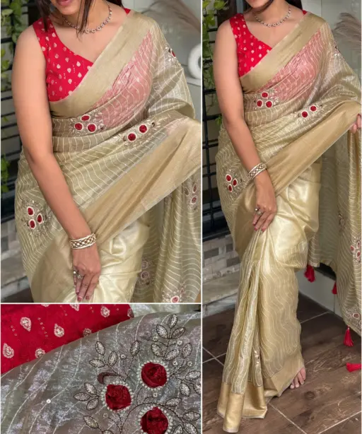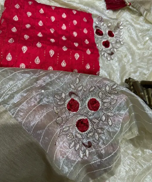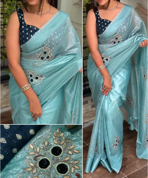 | Saree | Tissue Silk with tone-to-tone thread work, sequin touch, contrast blade cut thread work with zari, viscose border, and tussles in pallu |