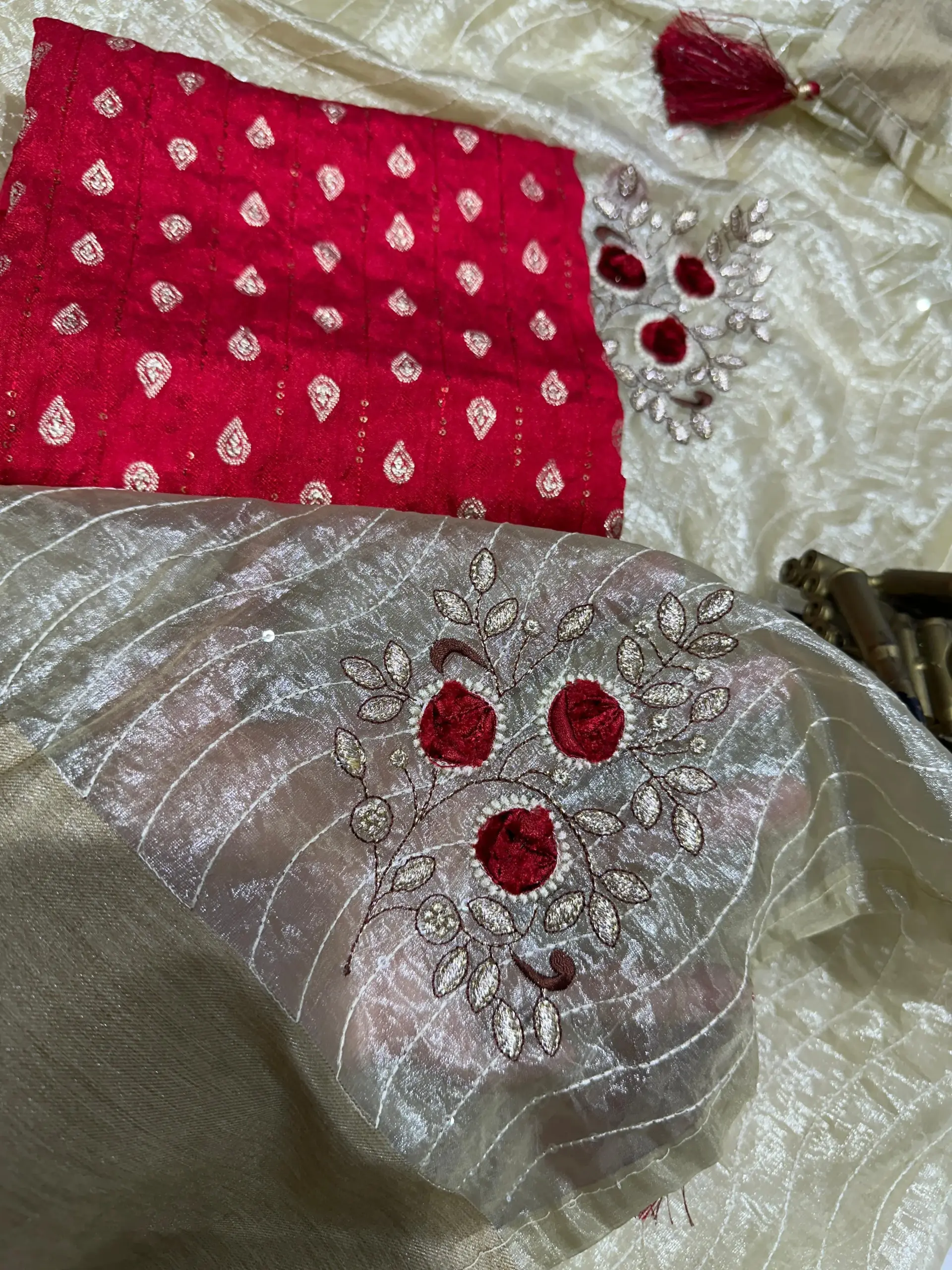 | Saree | Tissue Silk with tone-to-tone thread work, sequin touch, contrast blade cut thread work with zari, viscose border, and tussles in pallu |