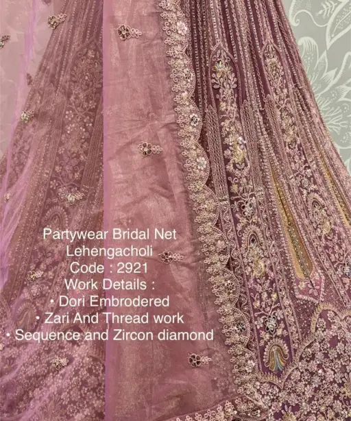 Lehenga: Bridal Net with Dori Embroidery, Zari & Thread Work, Sequins, Zircon Diamond Work, Standard Cancan & Canvas Attached, Free Size up to 42