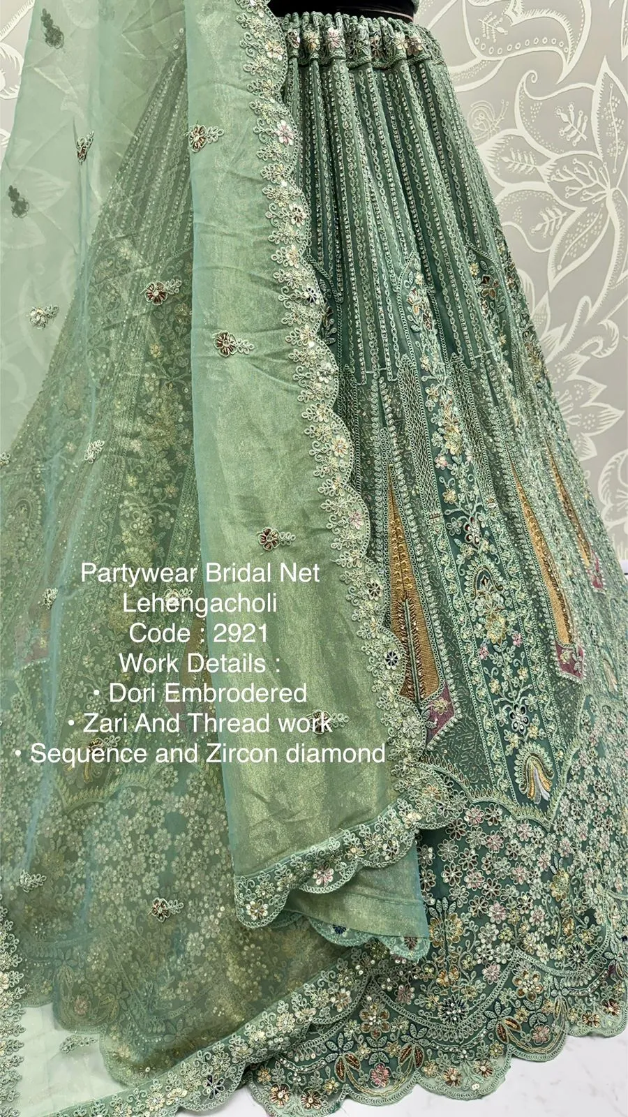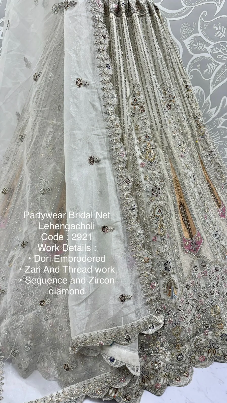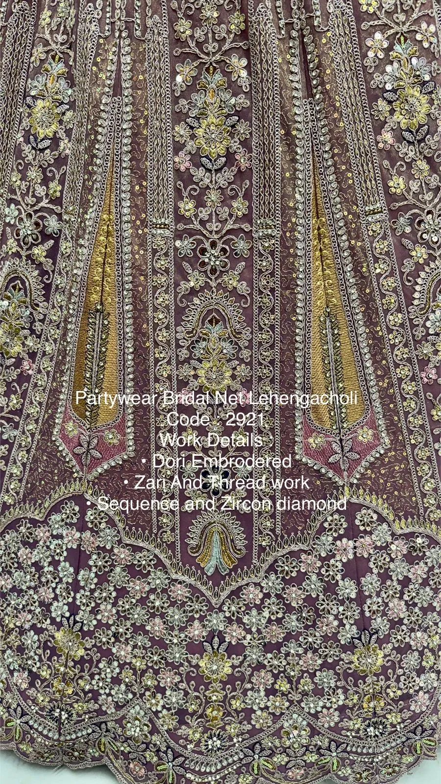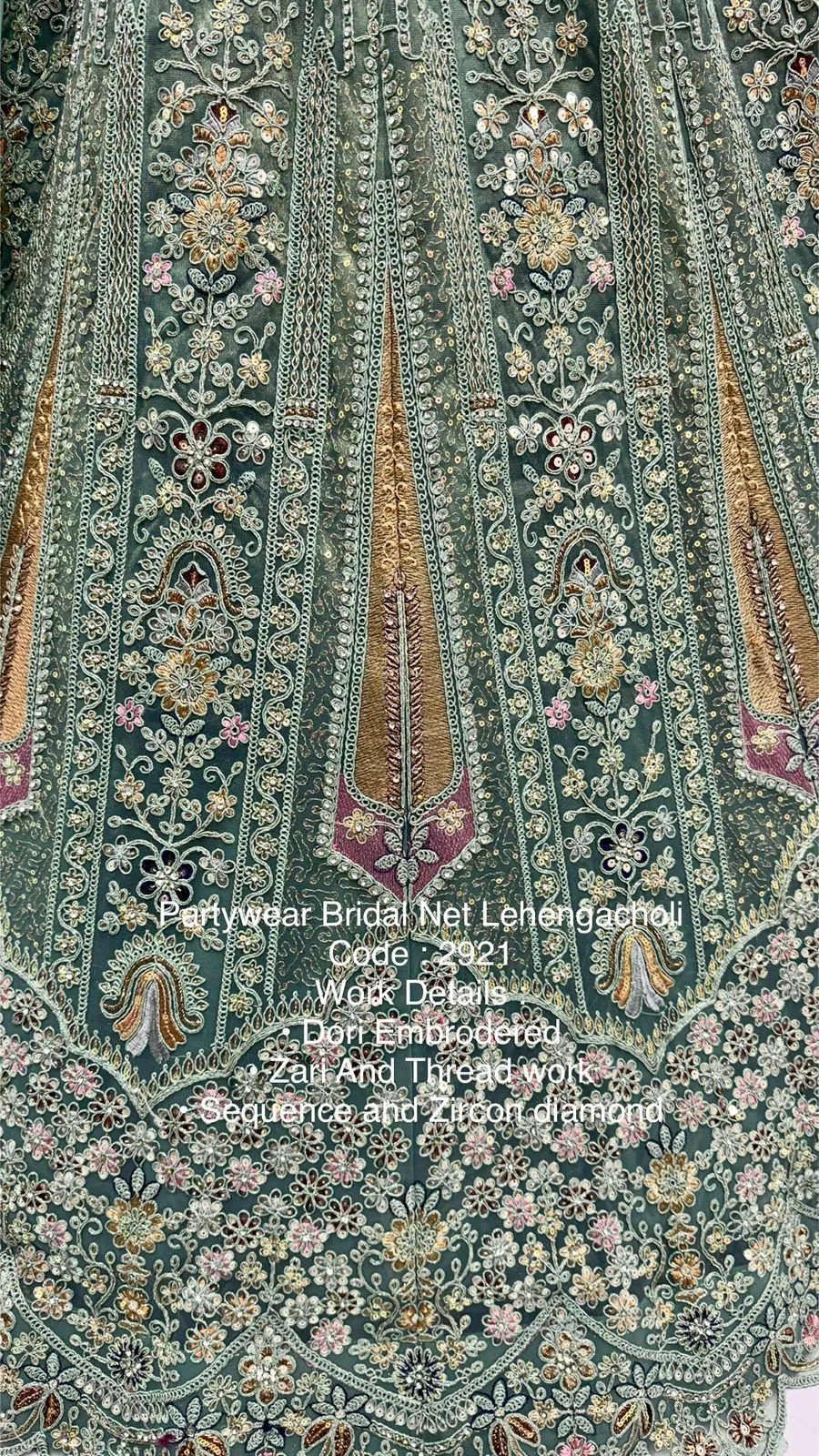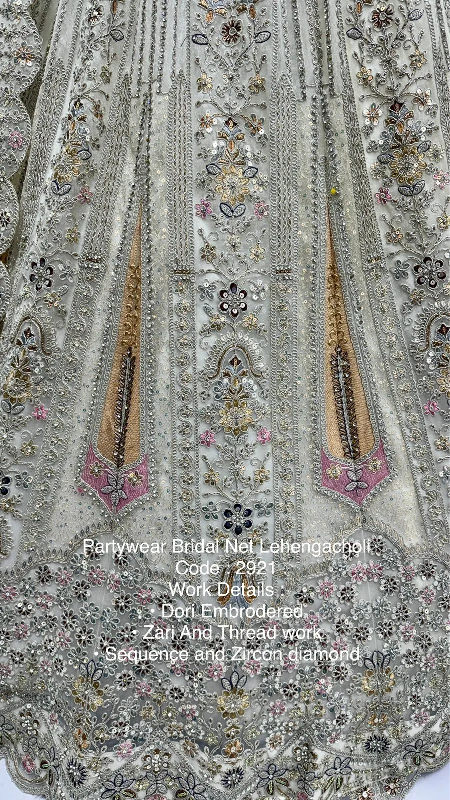 Lehenga: Bridal Net with Dori Embroidery, Zari & Thread Work, Sequins, Zircon Diamond Work, Standard Cancan & Canvas Attached, Free Size up to 42