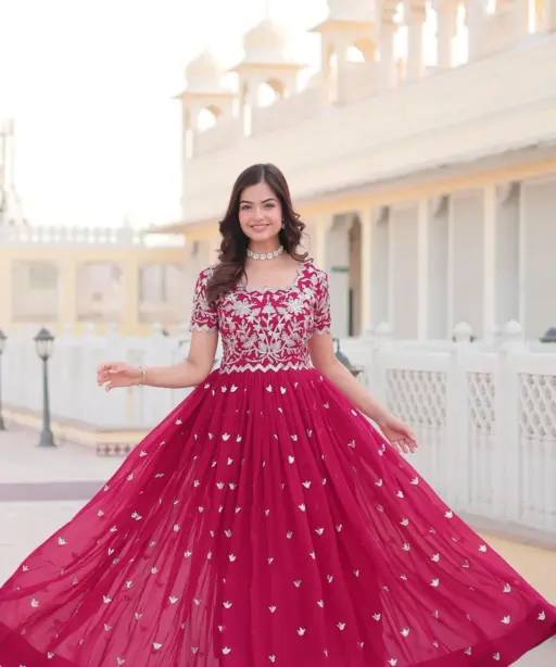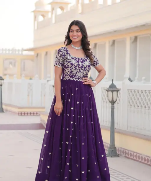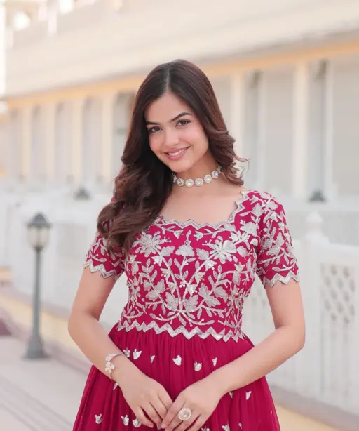 | Gown | Faux Blooming with Coding Sequins Embroidered Work Length 56 Inch Flair 3.5 Meter Sleeve Short Sleeves Cut Work Neck Type Round Neck Stitched with Canvas Patta |