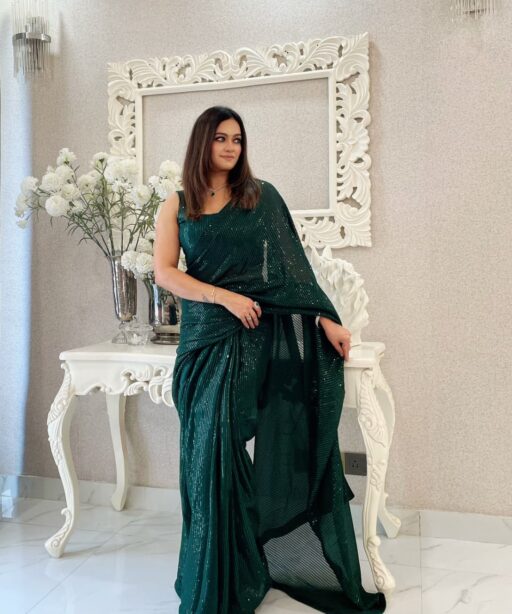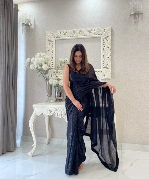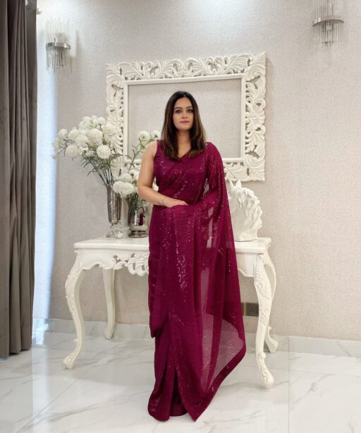 The lightweight nature of georgette ensures comfort, even for long hours of wear, while the glittering sequin details create a luxurious and festive appearance. Available in multiple colors including classic black, champagne gold, wine, maroon, and pastel tones, this saree can be styled to match any mood or event.