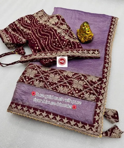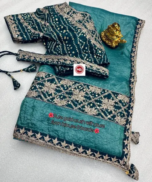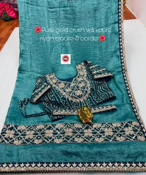 SareeSilk Base Gold Crush Fabric with Heavy Embroidery, Riyon Fabric Patta, Sequins & Coding Border Work