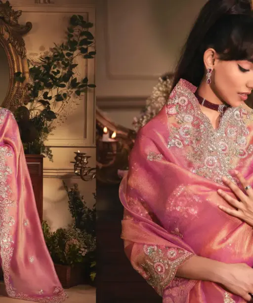 | Saree | Tissue Organza with Heavy Embroidery Stone Work Border & Designer Butta Work All Over |