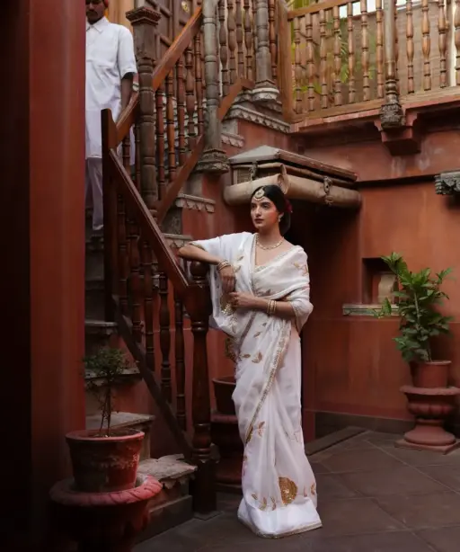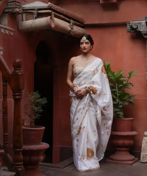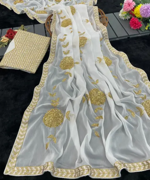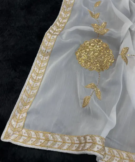 Pure White Saree with Golden Embroidery Bollywood Saree