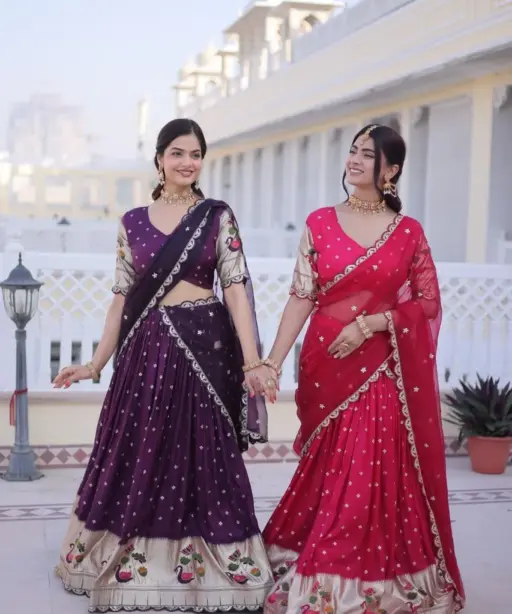| Lehenga | Dola silk with Meena Weaving With Sequins coding Embroidered lace Work. Length 42, Flair 3 Mtr |