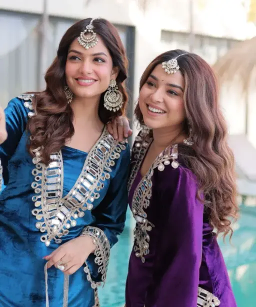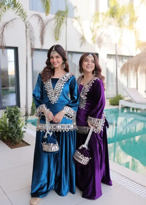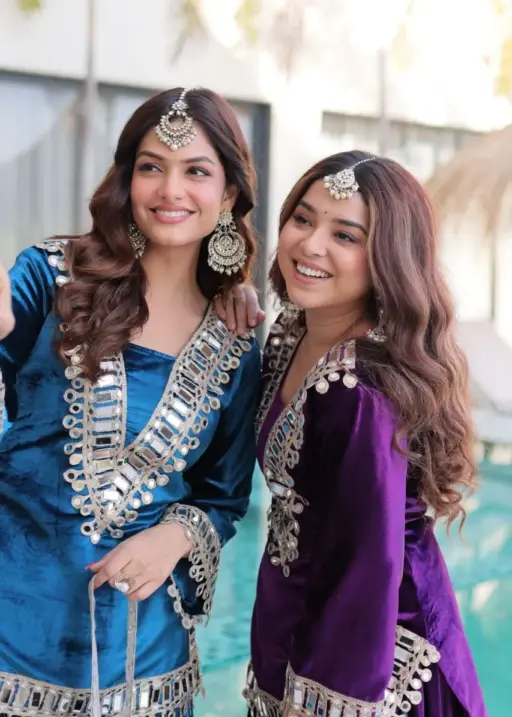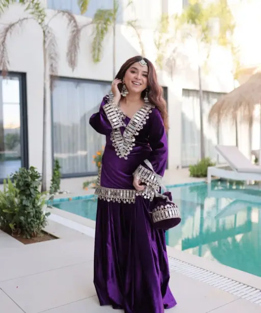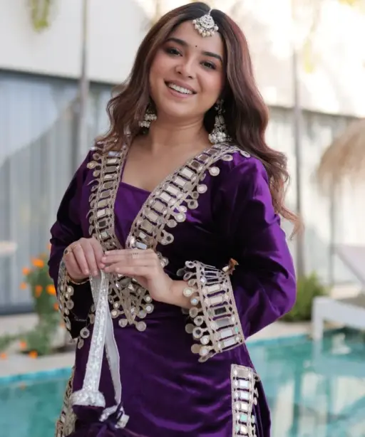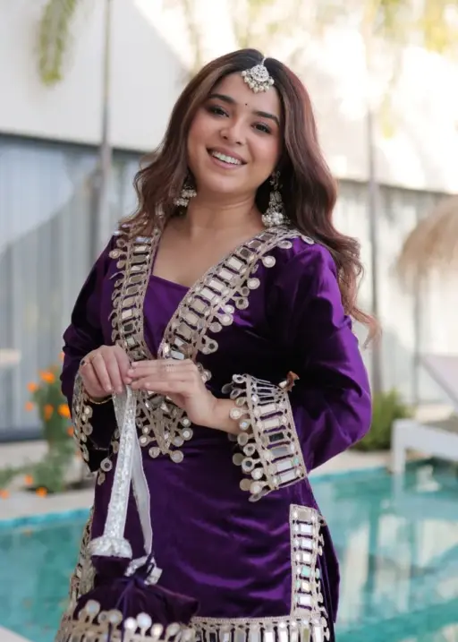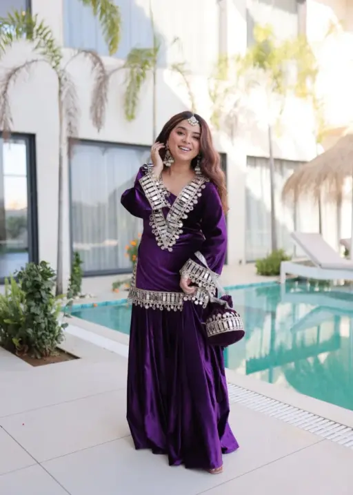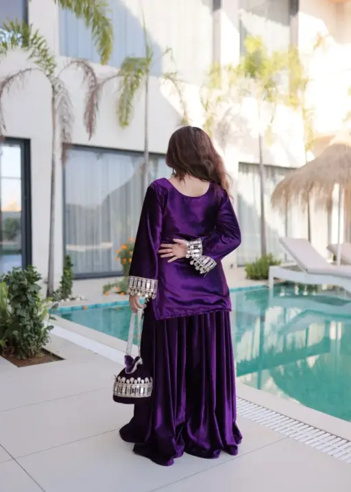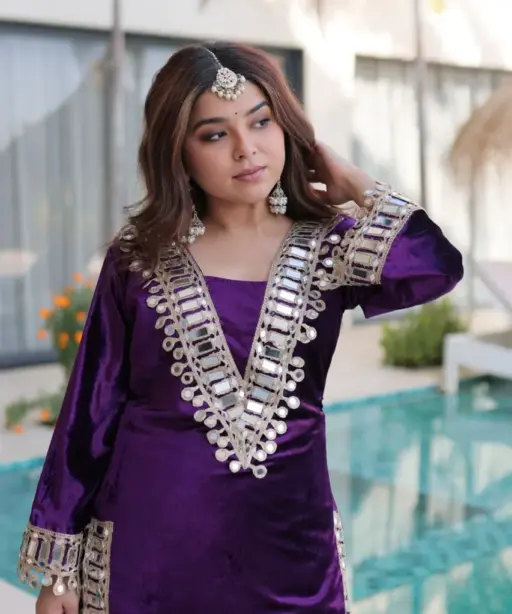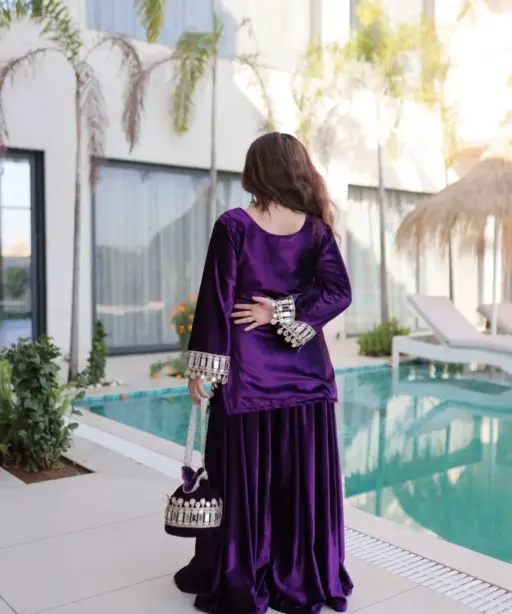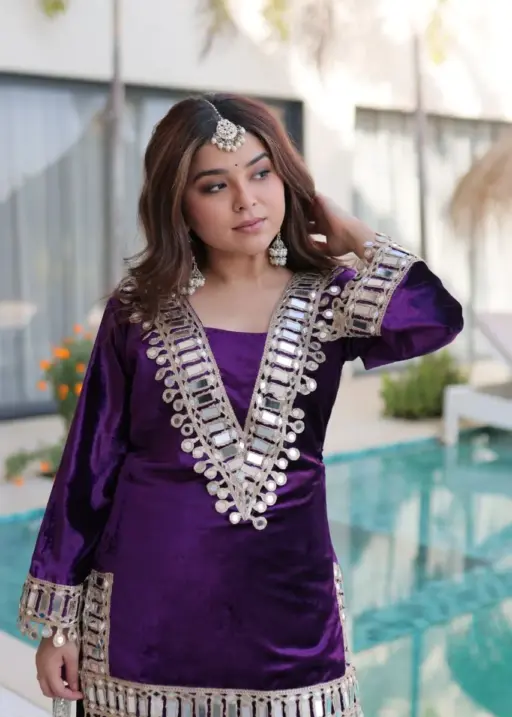 Purple Mirror Work Velvet Co ord Set with Batwa