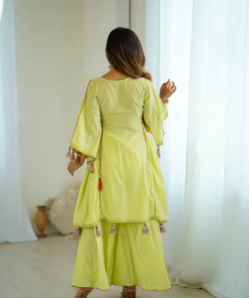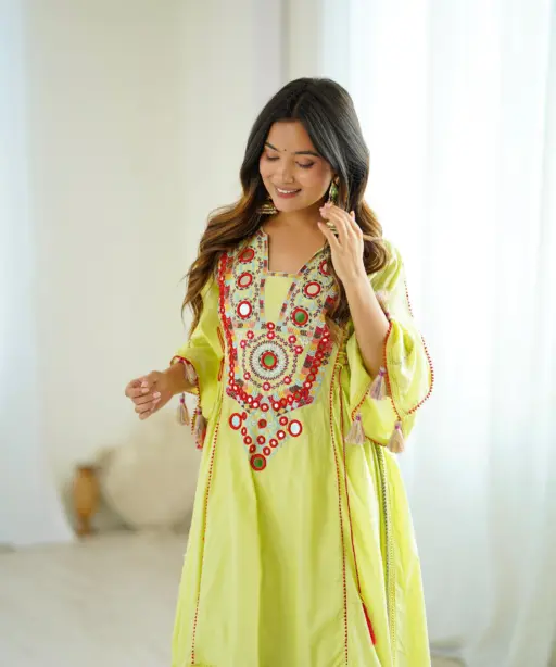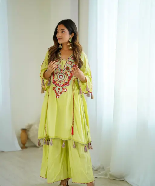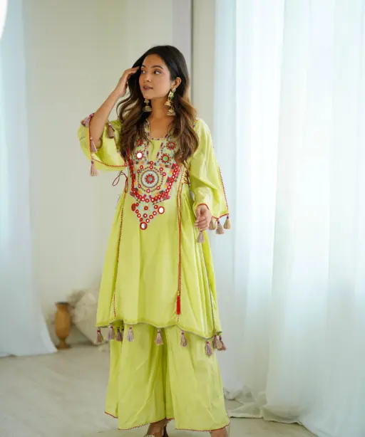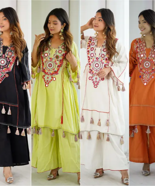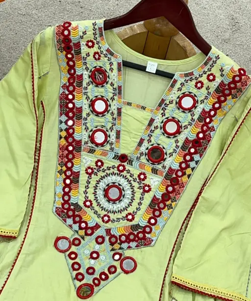 | Top | Pure Khadi Cotton with embroidery sequence & real mirror work, length 37-38″ |