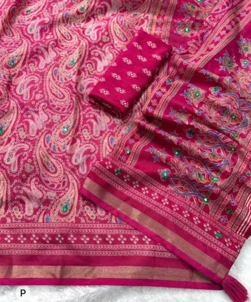 | Pattern | 1- morror work in full saree, 2 – Ajrakh Printed saree with zari jacquard border, 3- Tussles in pallu |