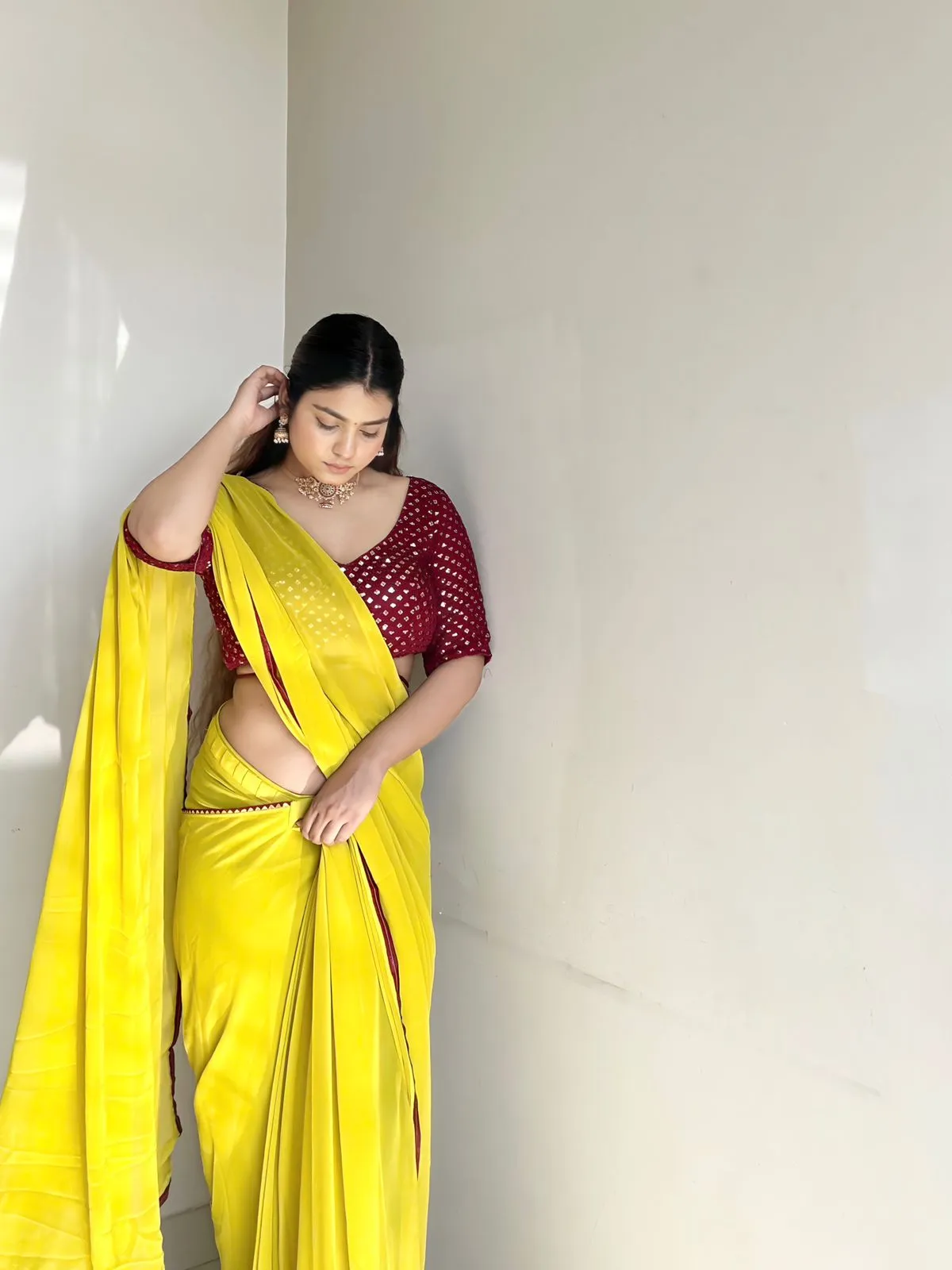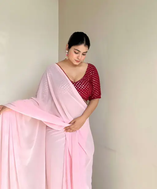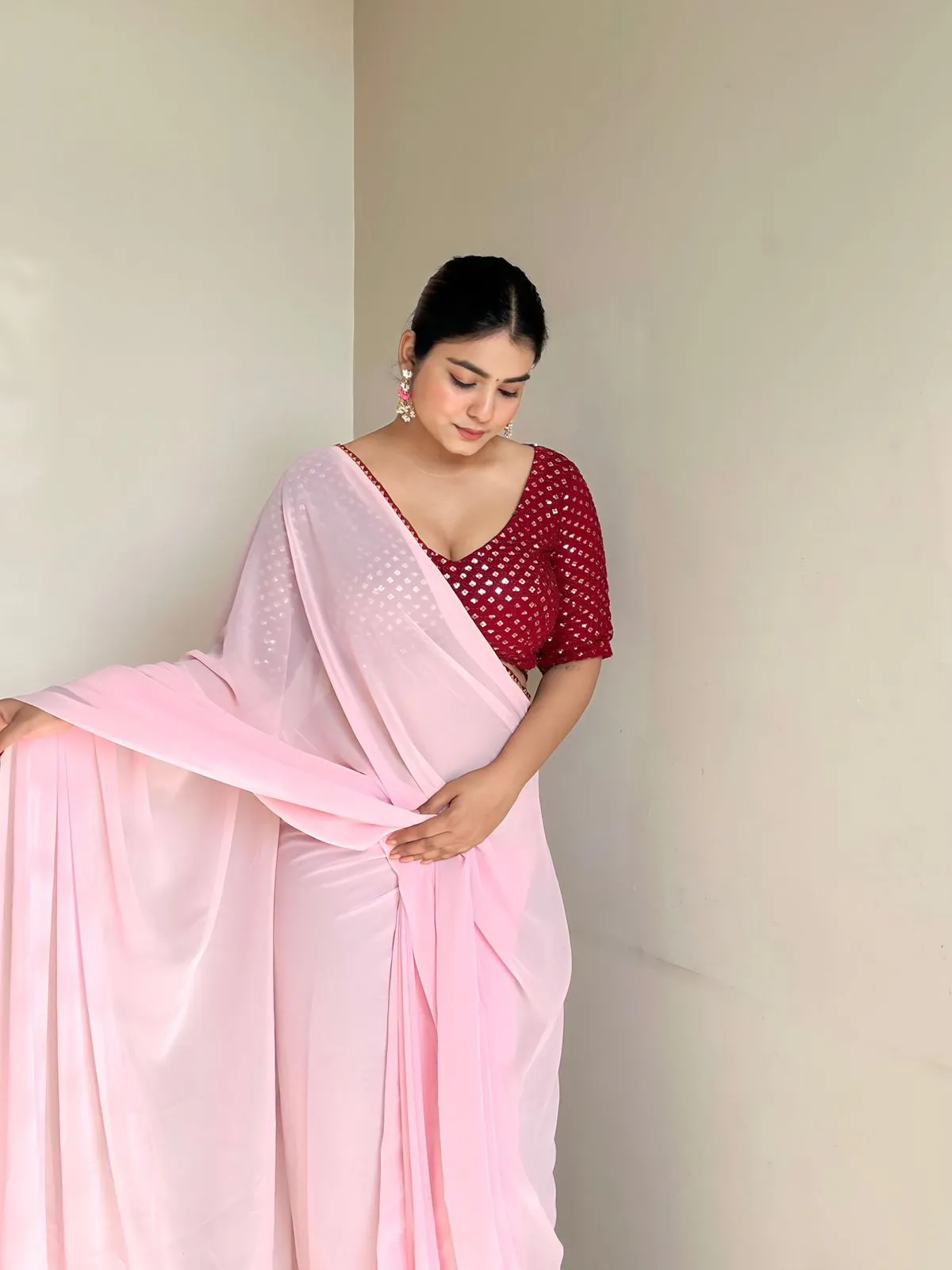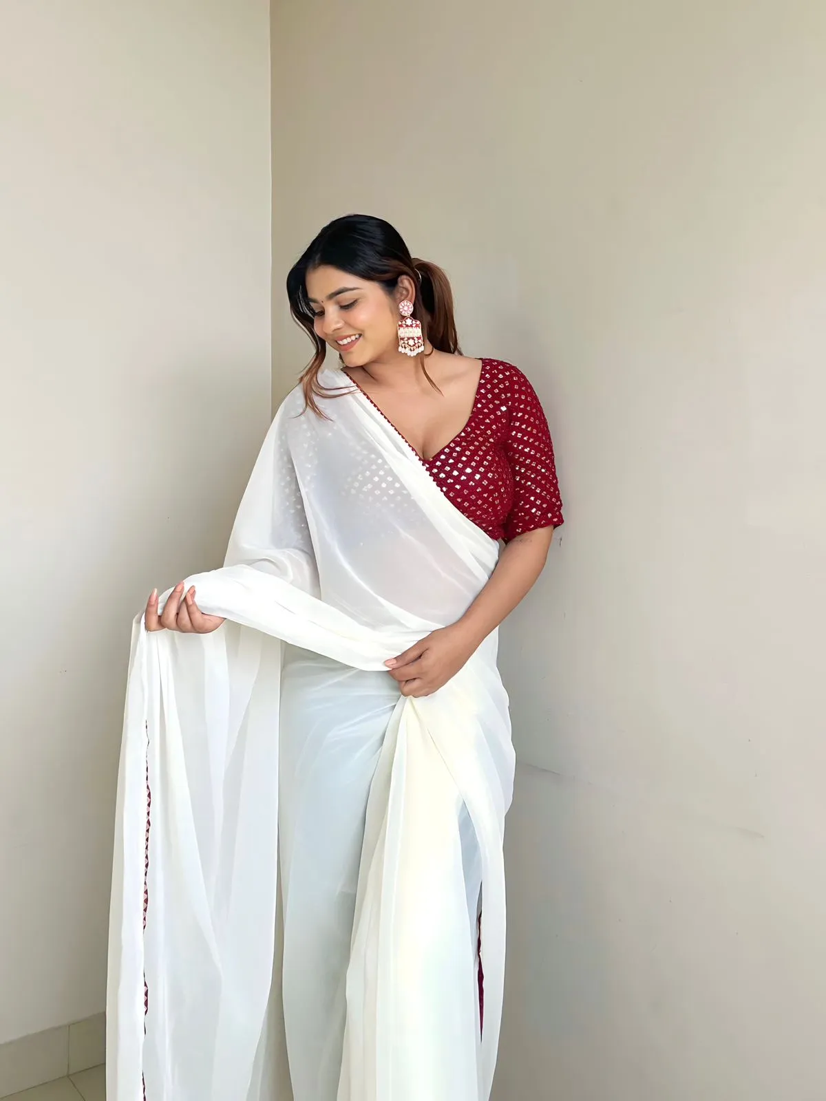 Ready-to-wear sarees have become a fashion staple, offering a perfect blend of traditional elegance and modern convenience. As we approach the festive season, a plain white ready-to-wear saree with a red sequence and embroidered blouse is an ideal choice for celebrations like Navratri, Diwali, and Karva Chauth. The subtle grace of a plain white saree exudes timeless charm, while the contrasting red blouse with intricate embroidery adds a touch of vibrancy and sophistication. This effortless ensemble not only saves you the hassle of draping but also ensures you stay stylish and comfortable throughout long festivities.