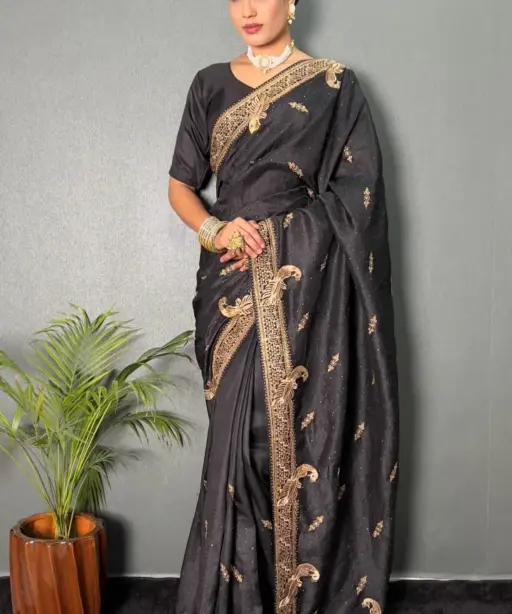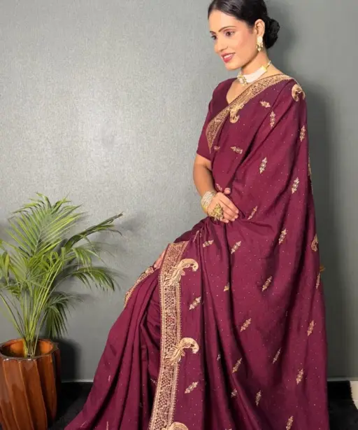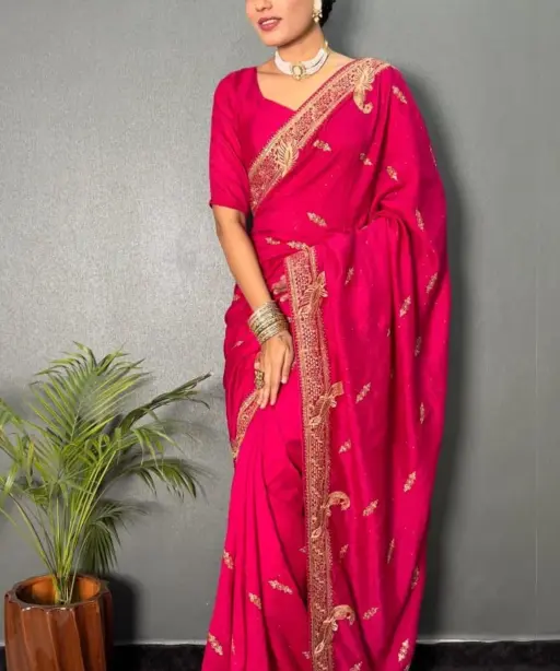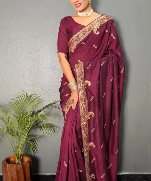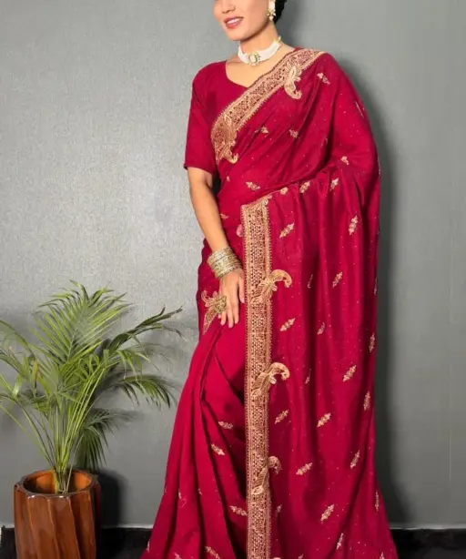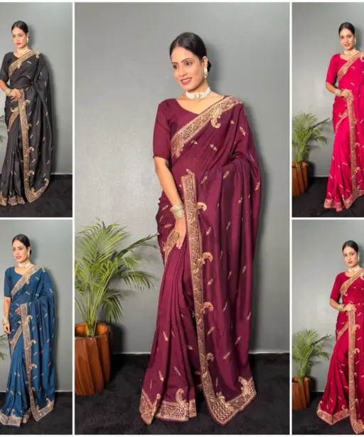 | Saree | Premium Blooming Vichitra Silk (Zari Work with DMC Swarovski Work & Piping Border) From 24 to 44 |