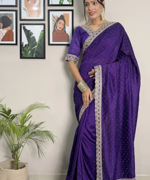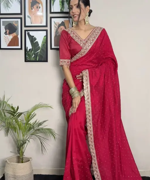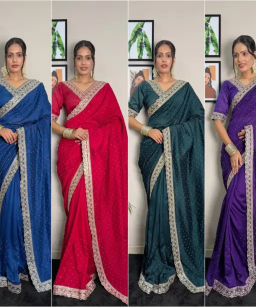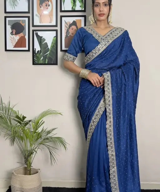| Saree | Ready To Wear Blooming Vichitra Silk with Embroidery Codding Work, Cut Work Border, and Swarovski work, Free Size upto 44 |