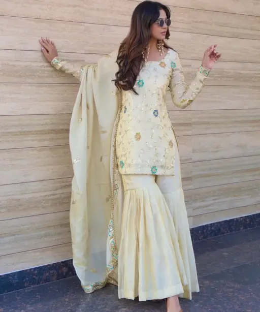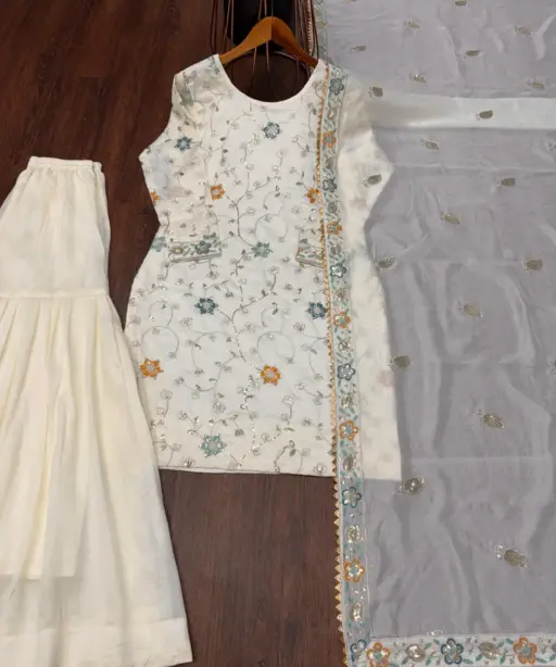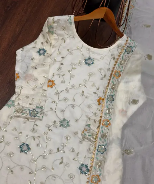 | Top | Heavy Pure Chinnon With 3MM Embroidery Sequence Work and Back Side Plain Length: 36- 37 inches |