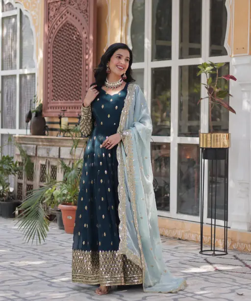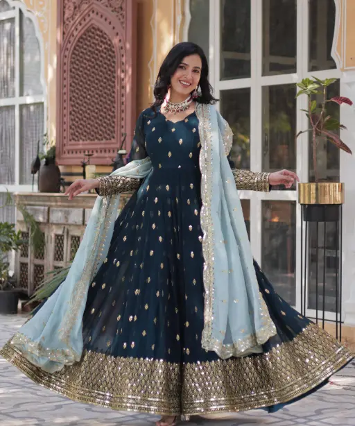 Elevate your ethnic wardrobe with our beautifully designed Readymade Georgette Gown Dupatta Set – the perfect blend of grace, comfort, and modern style. Crafted from premium quality georgette fabric, this designer gown is ideal for festive celebrations, weddings, parties, and cultural events. The set includes a finely stitched floor-length gown and a matching dupatta, offering a complete traditional look without the hassle of tailoring.