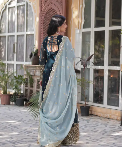 With the perfect balance of tradition and trend, this readymade gown dupatta set brings effortless elegance to your ethnic collection. Whether you’re styling it with ethnic jewelry or modern accessories, this outfit ensures you look polished and graceful. Its wrinkle-resistant, easy-to-maintain fabric makes it ideal for travel or long hours at events.