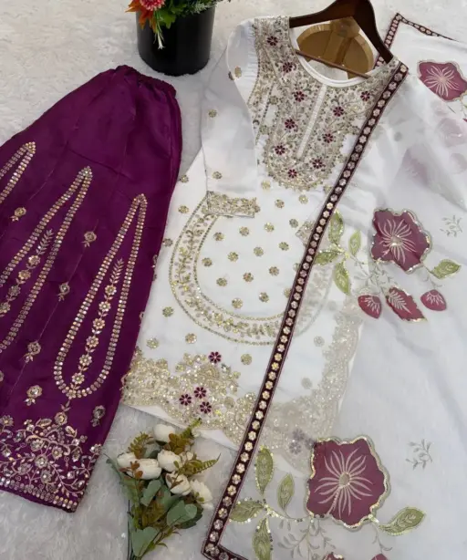 | Top | Pure GMY SILK With Heavy Embroidery Sequence Work With Full Sleeve Top Length 40-41 Inches |