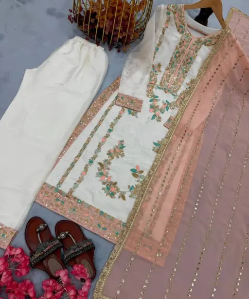 | Top | Pur Gmy Silk with Heavy Embroidery 5 mm Sequence Work with Rivet Moti Work with Sleeves 45-46 Inch Length |