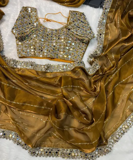 | Saree Fabric | Soft Satin Organza with Real Mirror Work Embroidery on Borders |