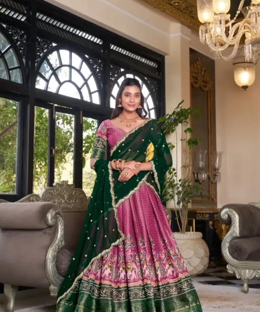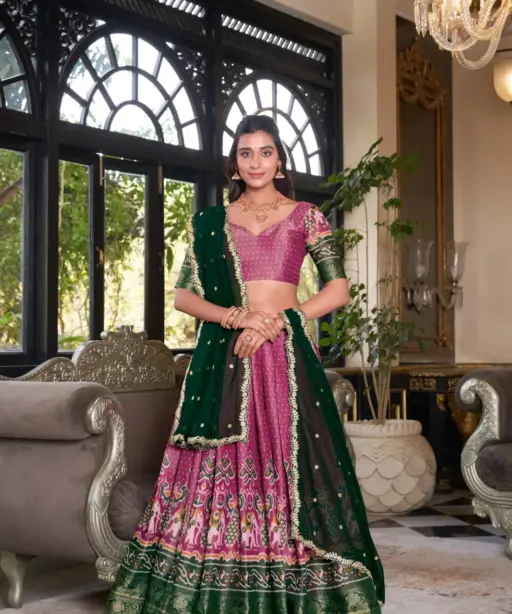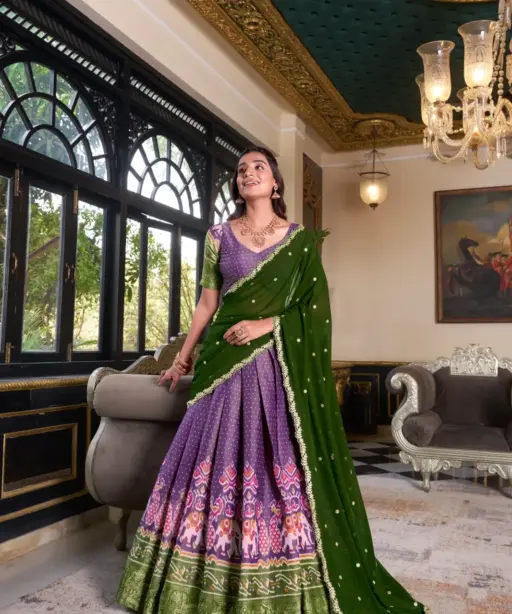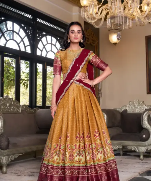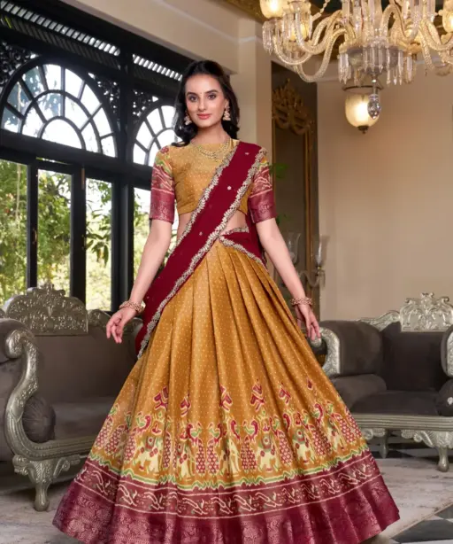 | Kanchipuram, Printed with Zari Weaving Work, Waist | Supported up to 42, Closure Drawstring with Zip, Stitching Stitched with Canvas and Cancan, Length 41 inches, Flair 3.60 meters, Inner Micro Cotton |