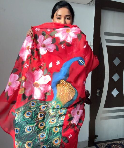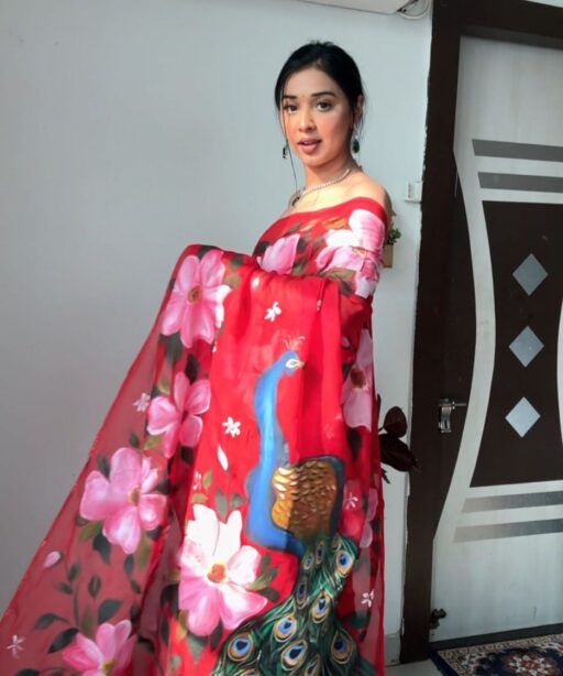 Red Color Organza Pre-Draped Saree with Peacock Print