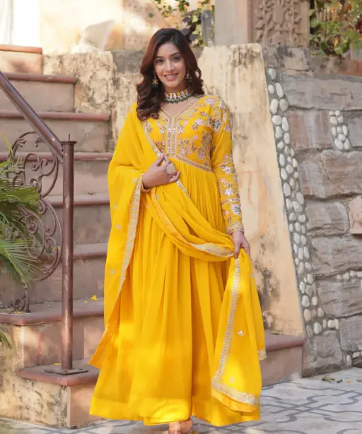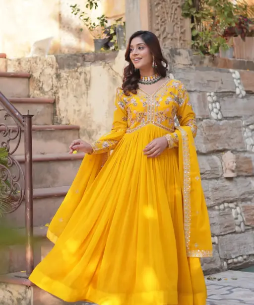 | Gown | Faux Blooming with Embroidery Zari Sequins Work Lining Cotton (Full Inner, Top to Bottom) Sleeves Full Sleeves Neck Type V Neck Flair 3.5 |