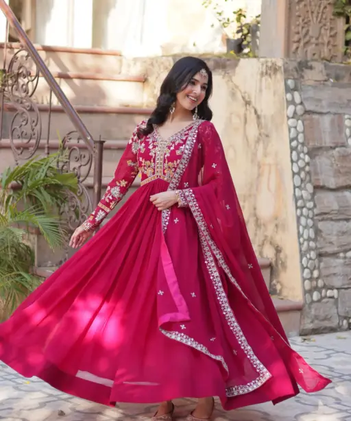 Rose Red Premium Pakistani Style Anarkali Gown For Ramzan Eid And Festive Wear