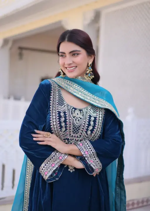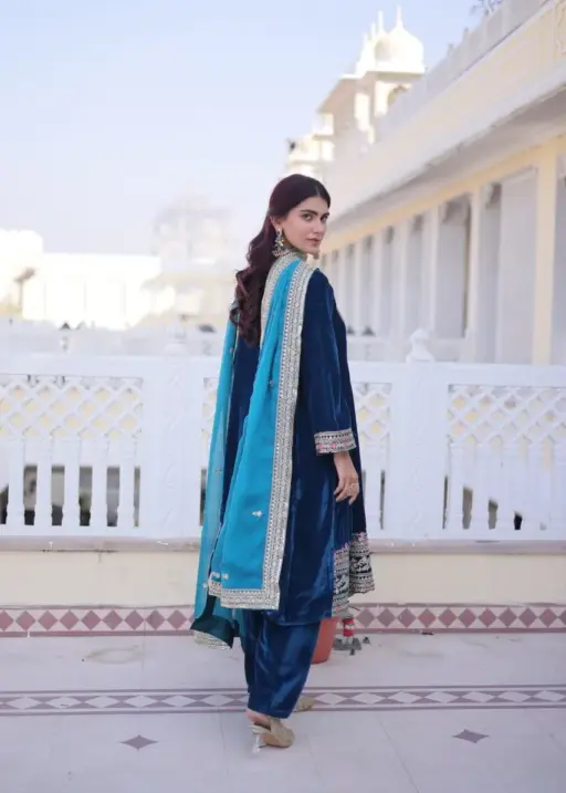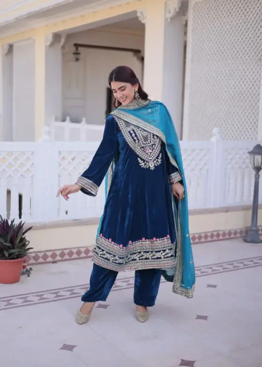 Royal Blue Velvet Pakistani Style Embroidery Suit for Eid