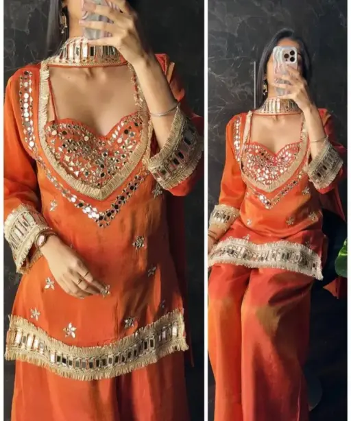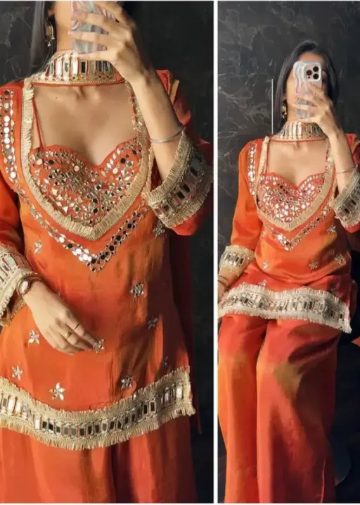 Top: Pure CRUNCHY SILK With Heavy Embroidery Sequence Work with Full Sleeve top 45-46 Length