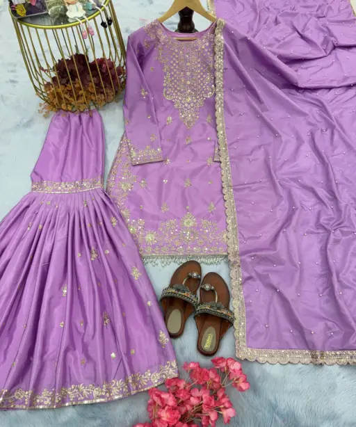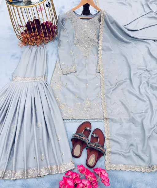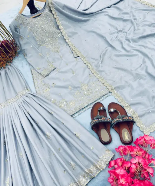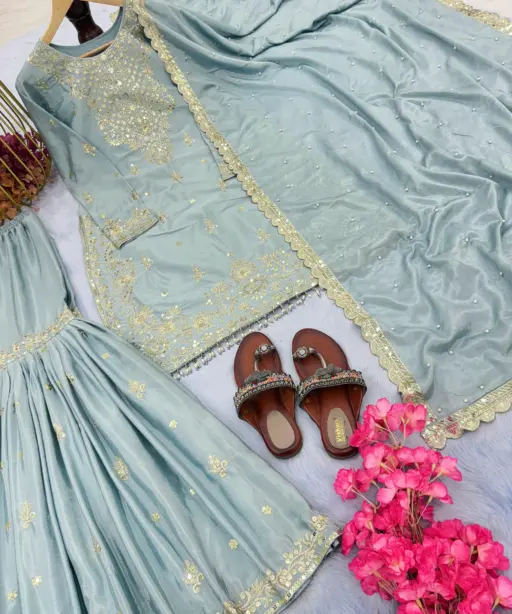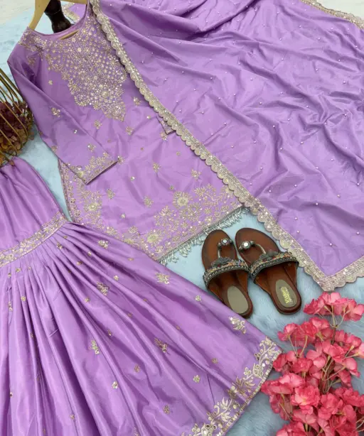 | Bottom | Pure Chinon Plazzo with Embroidery 5mm Sequence Work, Inner Micro Cotton, Length 40-41 Inch (Fully Stitched) |