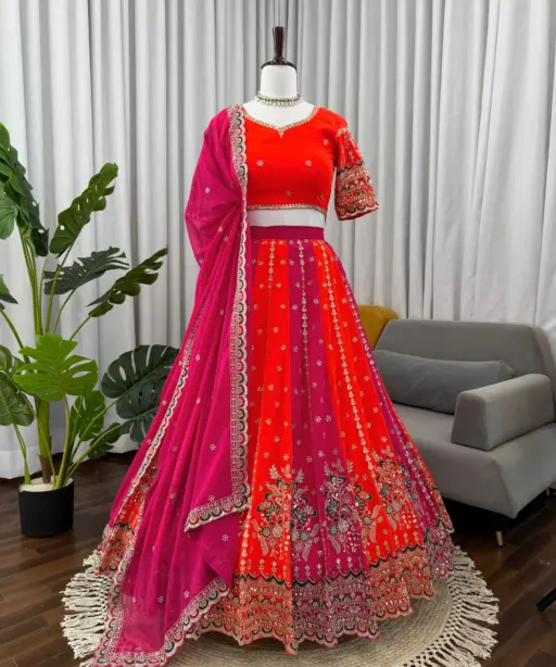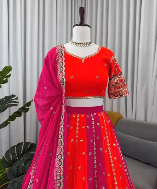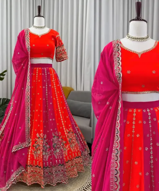 | Lehenga | Faux Georgette with Thread & Sequins Work, 4 Meter Flair with Cancan & Canvas, Inner: Soft Micro Lining (Fully Stitched, Fits up to Size 44) |
