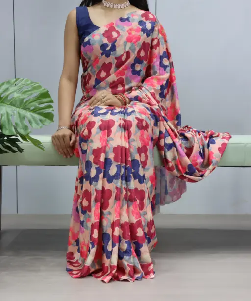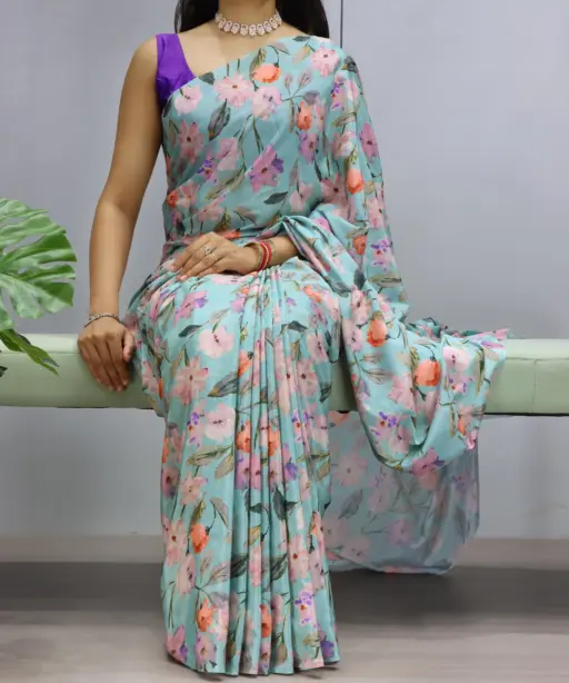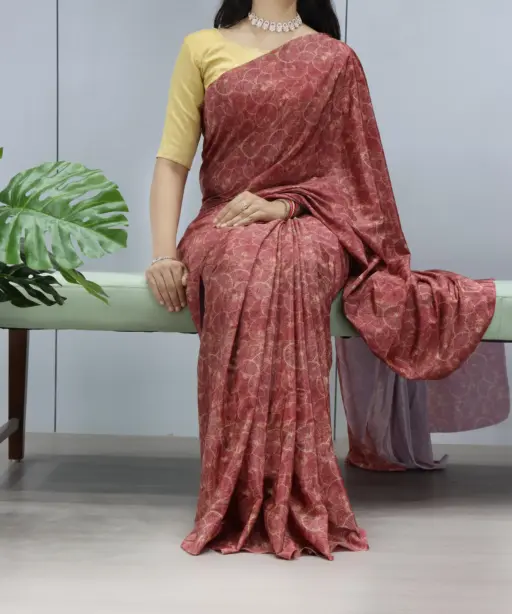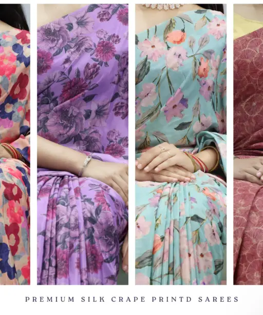 | Saree | Silk Crepe, All Over Printed Design, Length 5.5 Mtr, Weight 0.580 Kg, Pearl Lace Border |